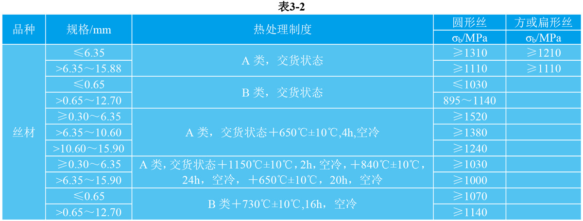GH145(GH4145)技术标准规定的丝材的室温力学性能见表3-2。