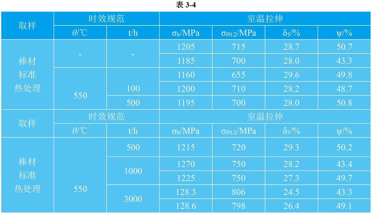 3.2.6.2 棒材经550℃长期时效,不同时效时间的室温拉伸性能见表3-4