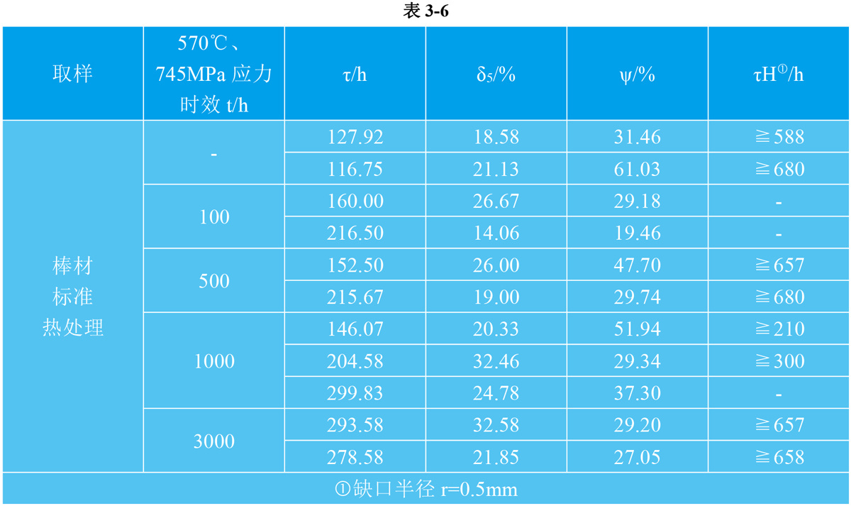 3.3.1.2 棒材经570℃、745MPa应力时效,不同时效时间的光滑和缺口持久性能见表3-6