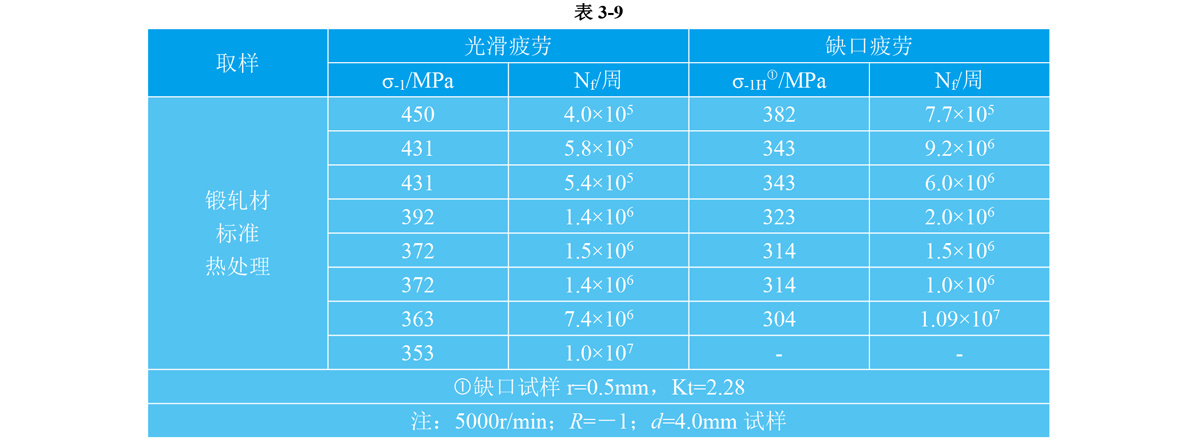 锻轧材室温旋转弯曲光滑和缺口疲劳极限见表3-9