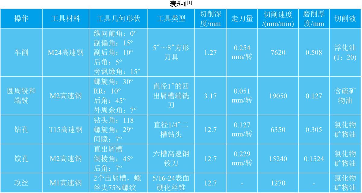 5.5 GH159切削加工与磨削性能 合金的机加工性能类似于GH738镍-钴-铬合金。可在冷加工强化和时效材料上进行机加工。冷拔态的GH159合金的机加工工艺参数见表5-1。