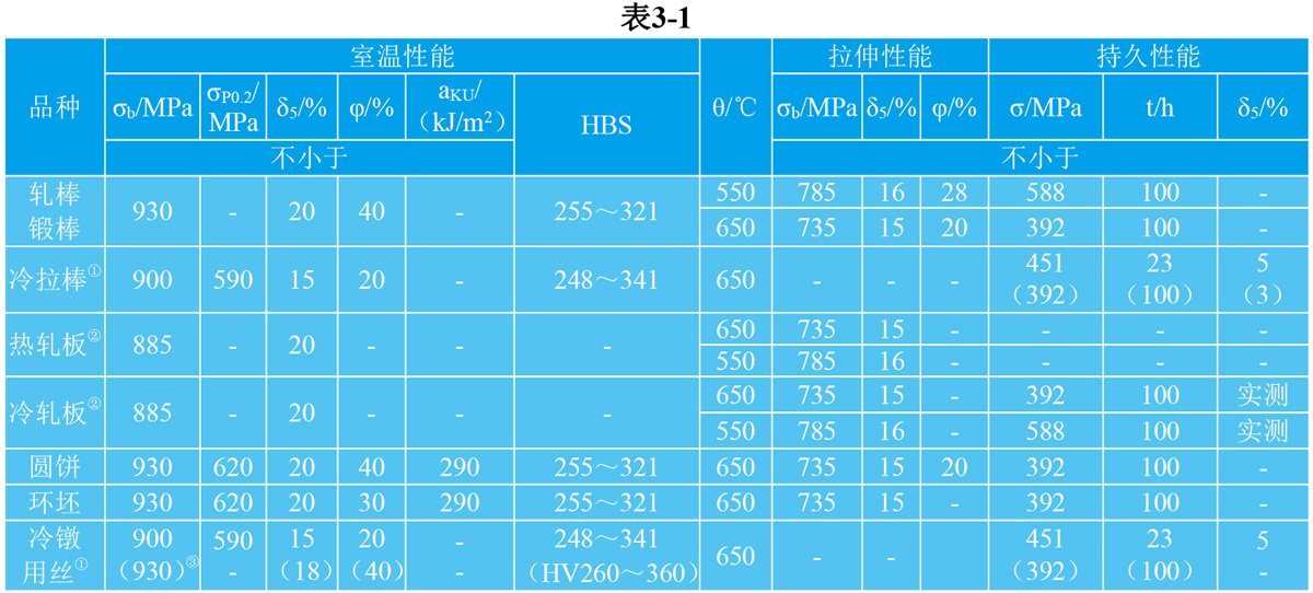 技术标准规定的性能 GH132合金见表3-1;优质GH132合金见表3-2
