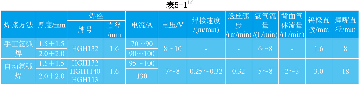 5.2.1 手工和自动钨极对接氩弧焊规范见表5-1。推荐采用HGH113焊丝和较小的焊接能量输入。