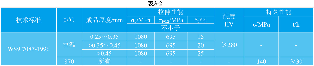 3.1.2 GH90冷轧薄板和带材(软态)技术标准规定的性能见表3-2。