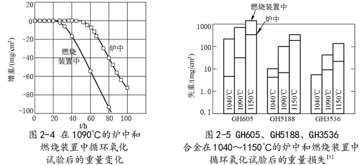 2.5.1.4 GH605由d12.7mm的棒材加工的楔形试样,在炉中1090℃的静止空气中加热3min,在空气中冷却不少于3min。循环试验总共为2000周(在高温下时间为100h);另一组试样在旋转式的燃烧装置中作循环试验,转速为1000r/min,在温度为1090℃的0.3马赫数的燃烧产物中保持3min,然后以0.7马赫数的冷空气吹3min,试验后试样的重量变化见图2-4。