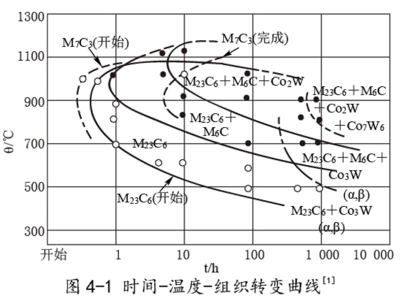 4.2 GH605时间-温度-组织转变曲线 见图4-1(合金经1225℃,30min,水冷处理)。