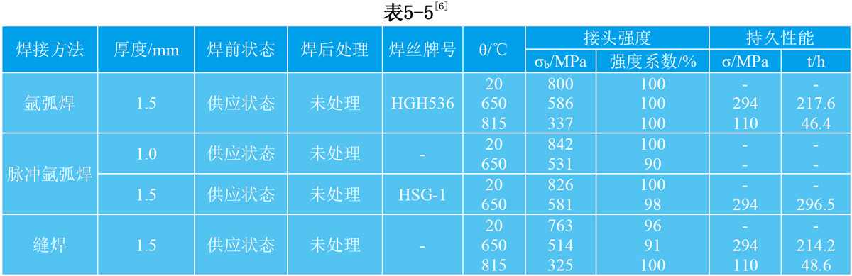 5.2.5 GH536焊接接头的力学性能见表5-5。