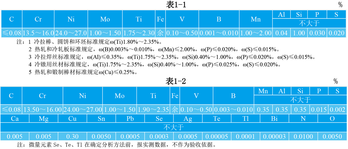 1.4 Incoloy A-286 化学成分 Incoloy A-286合金化学成分见表1-1,优质Incoloy A-286合金化学成分见表1-2。