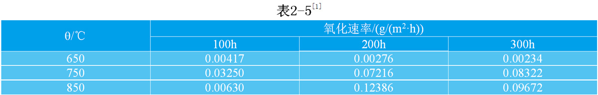 2.5.1 Incoloy A-286抗氧化性能 合金在空气介质中试验100~300h后的氧化速率见表 2-5。