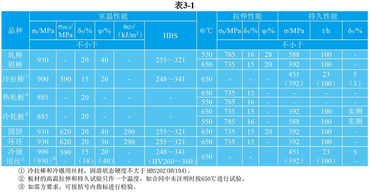 技术标准规定的性能 Incoloy A-286合金见表3-1;优质Incoloy A-286合金见表3-2