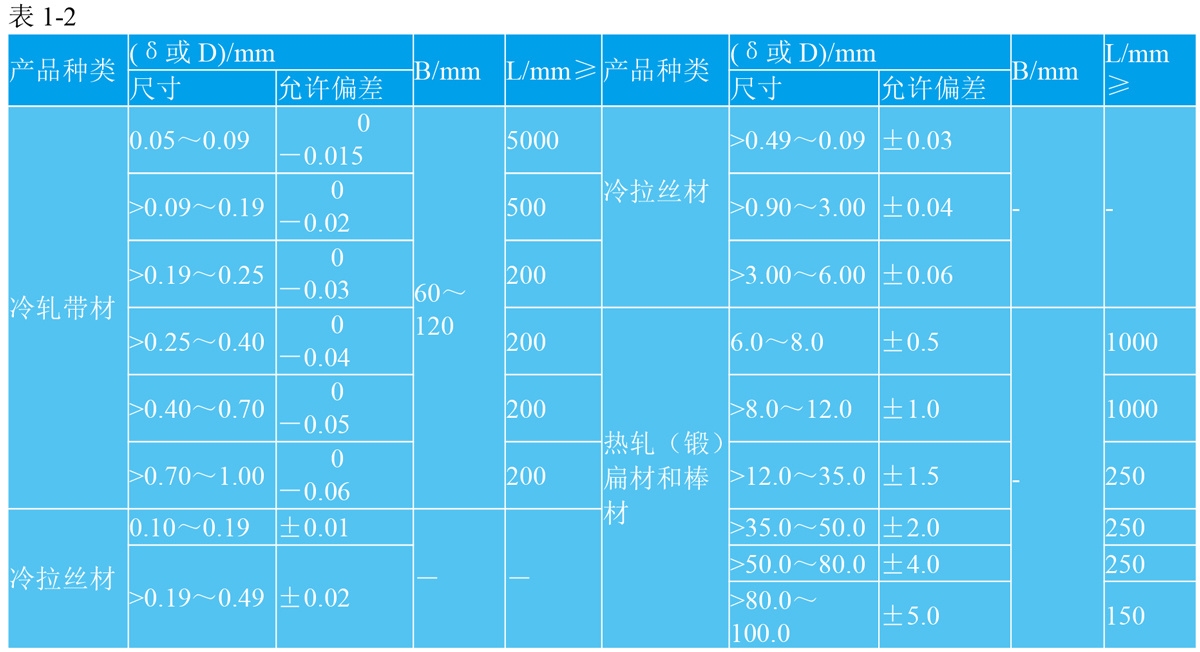 1.6 1J22品种规格与供应状态 以冷轧带材、冷拉丝材,热轧(锻)扁材和棒材,不经热处理供应。品种规格、尺寸及允许偏差见表1-2,对尺寸有特殊要求的,由供需双方协议。
