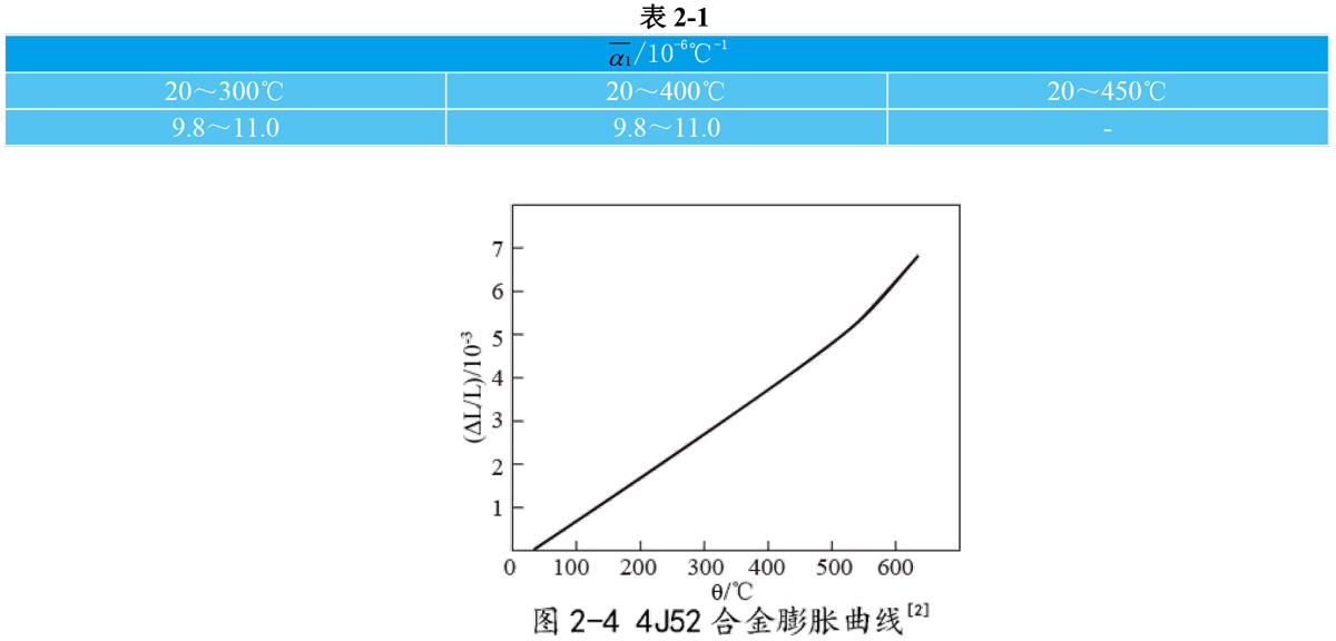2.1.4 4J52线膨胀系数 标准规定的合金平均线膨胀系数见表2-1。合金的平均线膨胀系数见表2-2。合金的膨胀曲线见图2-4。