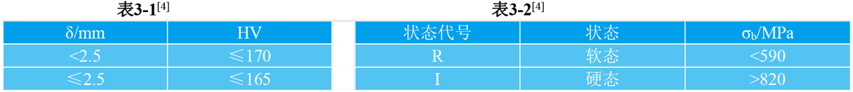 3.1.1 4J52硬度 深冲态带材应符合表3-1的规定。厚度不大于0.2mm的带材不作硬度检验。
