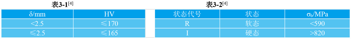 3.1.1 4J50硬度 深冲态带材应符合表3-1的规定。厚度不大于0.2mm的带材不作硬度检验。