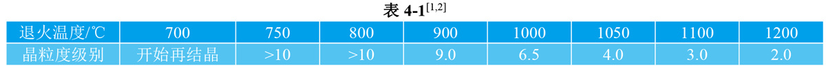 4.4 4J36晶粒度 冷应变率ε=60%~70%、厚度d=1mm的带材,在表4-1所示温度下退火1h,空冷后,按YB 027-1992标准进行晶粒度评级,结果见表4-1。