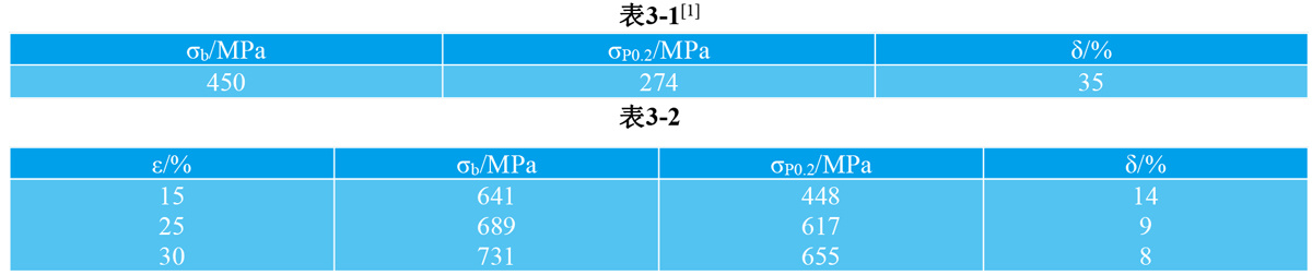 3.2.2 4J36拉伸性能 合金(退火状态)在常温下的拉伸性能见表3-1。在不同冷应变下的拉伸性能见表3-2。