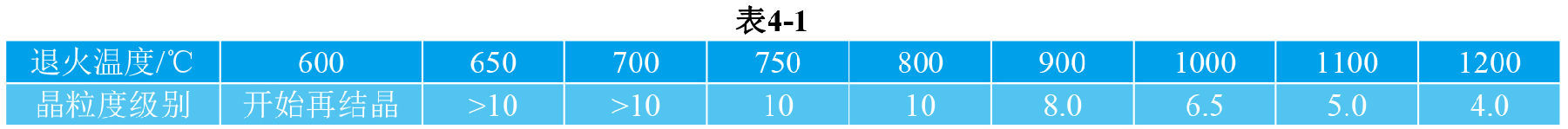冷应变率为60%~70%的1mm厚4J33带材,在表4-1所示温度下退火,空冷后,按YB 027-1992附录A进行晶粒度评级,结果见表4-1。