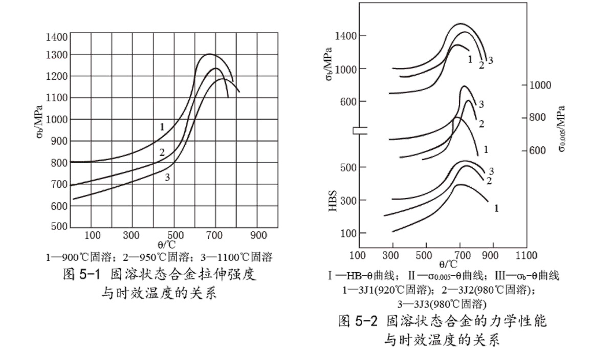 固溶处理后的时效,随时效温度的提高强化效果增强。含钼的合金在达到时效强化的峰值,温度继续升高,强化效果很快降低。见图5-2。